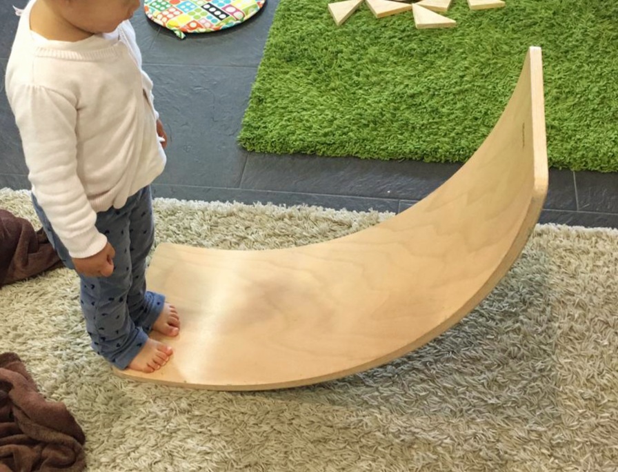 La tabla curva cada vez cobra más presencia, hasta en los hipermercados. Es un juguete que da opción a juego de movimiento también en un espacio pequeño, sin necesidad de agujerear las paredes ni hacer cambios en la distribución de muebles. Si no se usa, es fácil de guardar en un armario o debajo de la cama. Sirve para balancearse sobre ella (hacer posturas de yoga), de hamaca para los más pequeños, apoyada sobre un sofá, de tobogán, de puente para pasar por encima los coches o trenes, o pasar a gatas bajo ella. Y para otros mil usos, impredecibles en el juego simbólico. Nosotras tenemos, desde hace muchos años, la de Ocamora, una empresa familiar y artesana española.